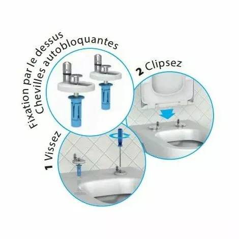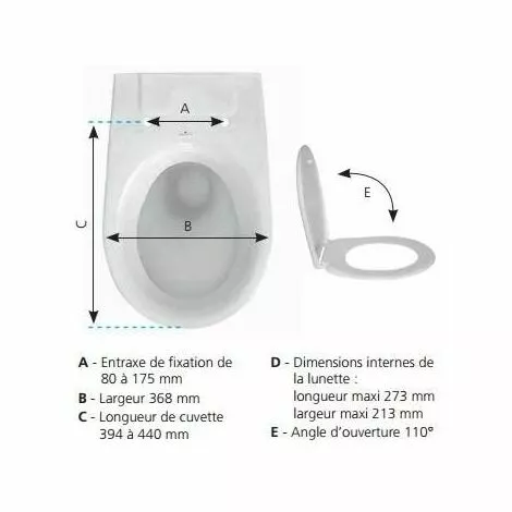 | – Siamp MONACO référence 95 9001 10. – Modèle Principauté PREMIUM Thermodur. – Poids: 2.5kg – Fermeture ralentie – Déclipsable en 1 geste – Montage express, chevilles autobloquantes avec fixations par le dessus. – Forme droite et recouvrante – Inrayable – Bactéricide – Charnières en Inox – Fabriqué en EUROPE. – Entraxe des fixations réglables de 80 à 175 mm – Dimensions de l’abattant: 433 x 368 mm (Lxl) – Coloris: Blanc – Angle d’ouverture: 110° |